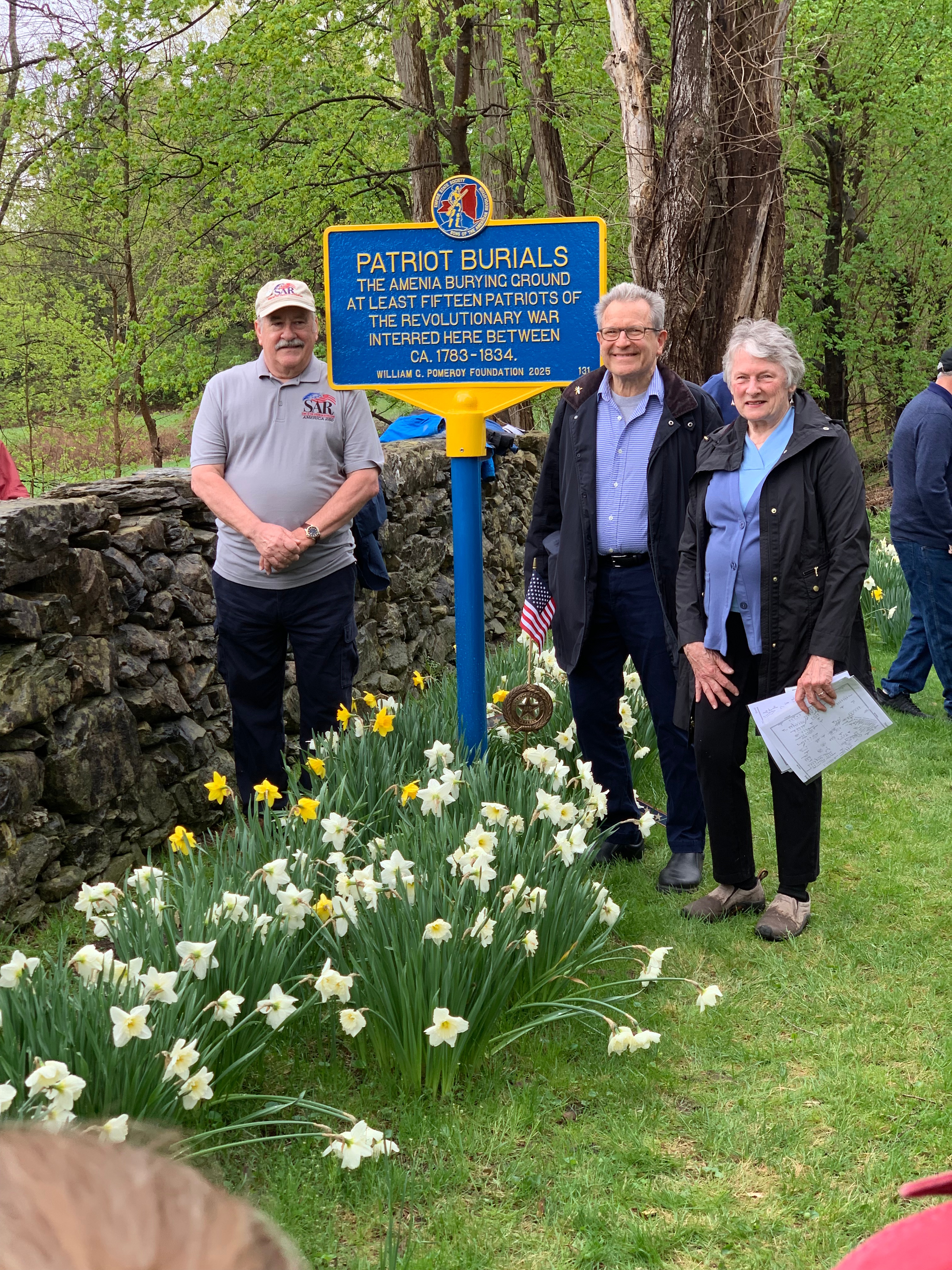 Assisted by Dutchess County Sons of the American Revolution and the Pomeroy Foundation, a Patriot Roadside Marker was unveiled and the names of the Revolutionary soldiers buried there were read aloud by Tim Middlebrook. Amenia Town Supervisor, Leo Blackman, and Town Historian Betsy Strauss were also in the photo.